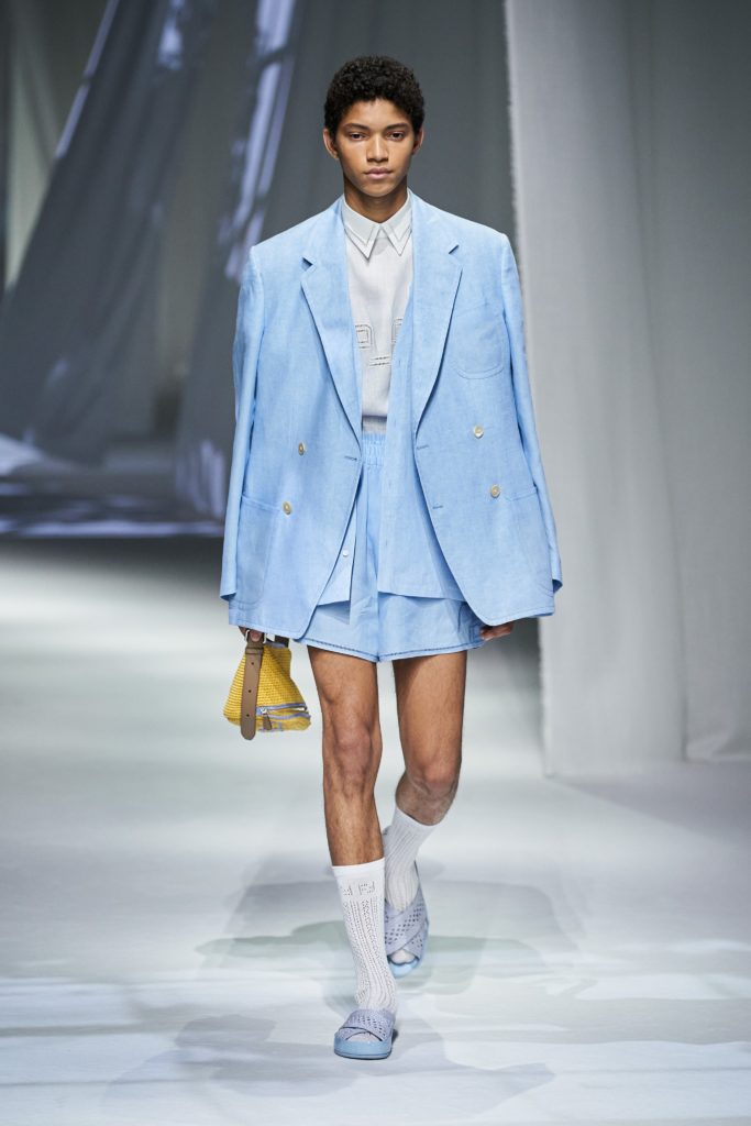 Небесно-голубой – один из самых красивых цветов и в женских, и в мужских коллекциях. Amiri предлагают носить бомберы в таком оттенке, а Fendi – оверсайз-пиджаки с бермудами.