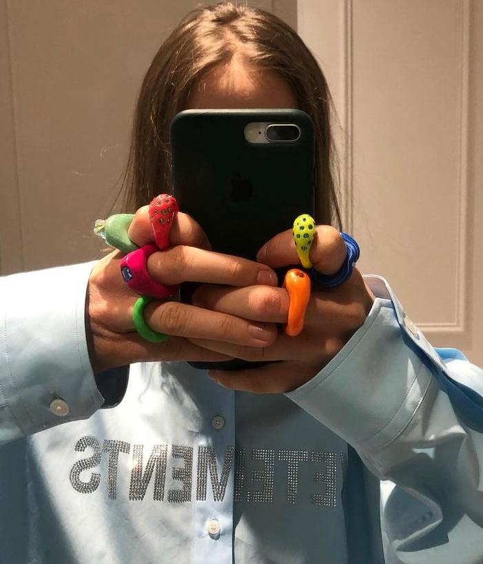 Носить эти кольца можно так, как тебе нравится. Например, в дуэте с бисером или, как делает ваш редактор моды, с печаткой LevashovaElagina. И пожалуй, дадим главный совет: не бойся быть too much. Чем больше игрушечных украшений ты наденешь за раз, тем круче.