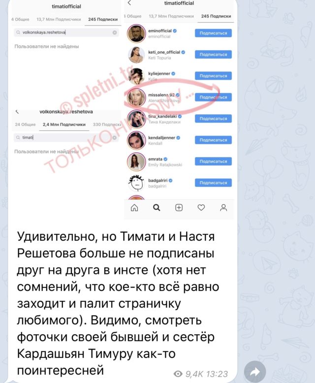 Девушке Тимати (35) и бизнесвумен Анастасии Решетовой (23) часто прилетает от хейтеров. На этот раз в Сети появились слухи о разладе в паре. А все из-за того, что рэпер не подписан на свою возлюбленную! Об этом сообщает Telegram-канал «Только никому»: «Удивительно, но Тимати и Настя Решетова больше не подписаны друг на друга в инсте (хотя нет сомнений, что кое-кто всё равно заходит и палит страничку любимого). Видимо, смотреть фоточки своей бывшей и сестёр Кардашьян Тимуру как-то поинтересней».