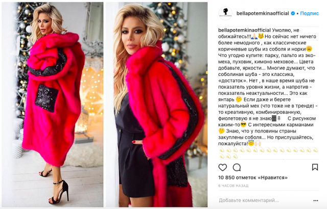 Дизайнер Белла Потёмкина любит поговорить со своими подписчиками: дает советы по стилю, делится новинками, рассказывает о трендах. И вот, Белла опубликовала пост, в котором призвала девушек отказаться от примитивных шуб и обратить внимание на что-то яркое и неординарное, например на шубы из экомеха.