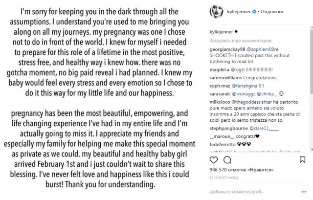 Это случилось! Кайли Дженнер (20) официально подтвердила, что стала мамой. «Моя прекрасная и здоровая малышка родилась 1 февраля, и я не могла дождаться, чтобы поделиться этим. Я так полна любви и счастья, что сейчас взорвусь», — написала звезда-реалити в Instagram.