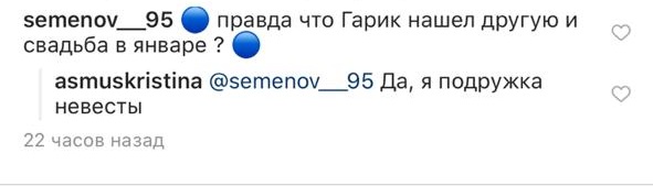 Вот уже который день в Сети ходят слухи о том, что Гарик Харламов, не успев еще развестись, женится. Якобы комик уже в январе 2021-го вновь готовится связать себя узами брака с новой женщиной. Правда, сам Харламов информацию не комментирует, а вот его супруга (пока еще) Кристина Асмус ответила на слухи в Instagram!