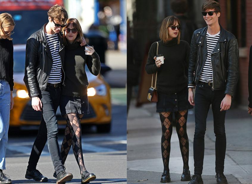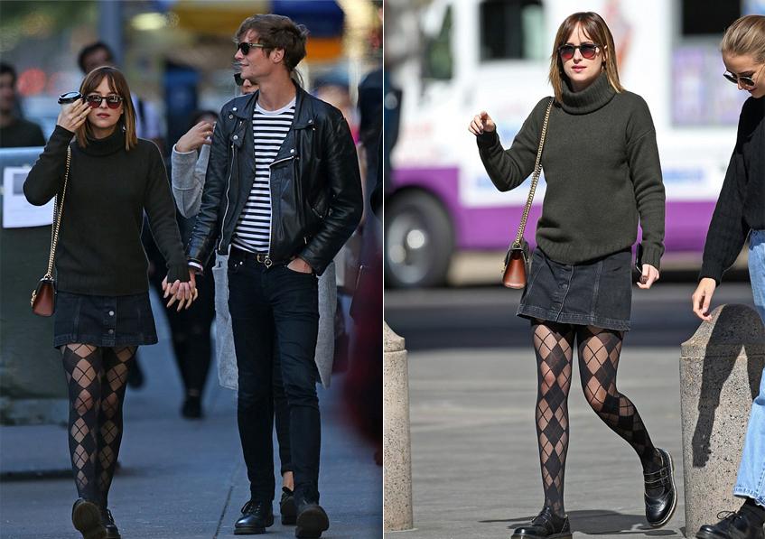 10 октября девушка вышла на прогулку в Нью-Йорке в компании своего возлюбленного Мэттью Хитта (28), с которым, по слухам, Дакота недавно рассталась. Несмотря на то, что актриса и ее спутник выглядели очень счастливыми и держались за руки, фанатов больше волновал наряд девушки. Казалось, что Дакота решила отойти от своего знойного образа и вернулась в 90-е. Для прогулки актриса выбрала темный вязаный свитер, джинсовую юбку на пуговицах, темные колготки с узором и тяжелые черные ботинки.