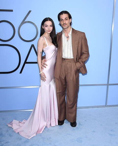 Дав появилась на красной дорожке в атласном платье в пол нежно-розового оттенка, которое напоминает свадебный наряд. Дамиано для выхода предпочел коричневый костюм.