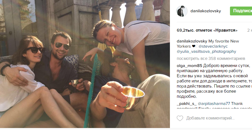 Данила Козловский (31) и его девушка Ольга Зуева сейчас находятся в Нью-Йорке. В США Ольга, которая хочет сделать карьеру режиссера, живет и работает. Там они проводят время в компании друзей, а, может, и работают над совместным проектом.