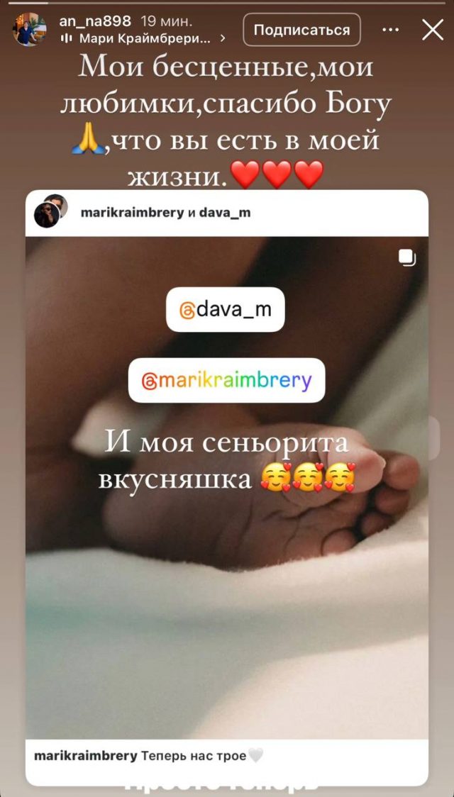 Дава и Мари Краймбрери обзавелись новым статусом – у пары родился первенец. Супруги не стали скрывать радостную новость от своих поклонников и поделились ею в запрещенной соцсети.