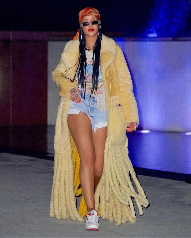 Эта шуба стала фаворитом звезд Голливуда. В 2020 году ее не снимая носила Хейли Бибер, а Рианна сочетала модель с фирменной банданой, солнцезащитными очками и ультракороткими шортами. Может себе позволить!