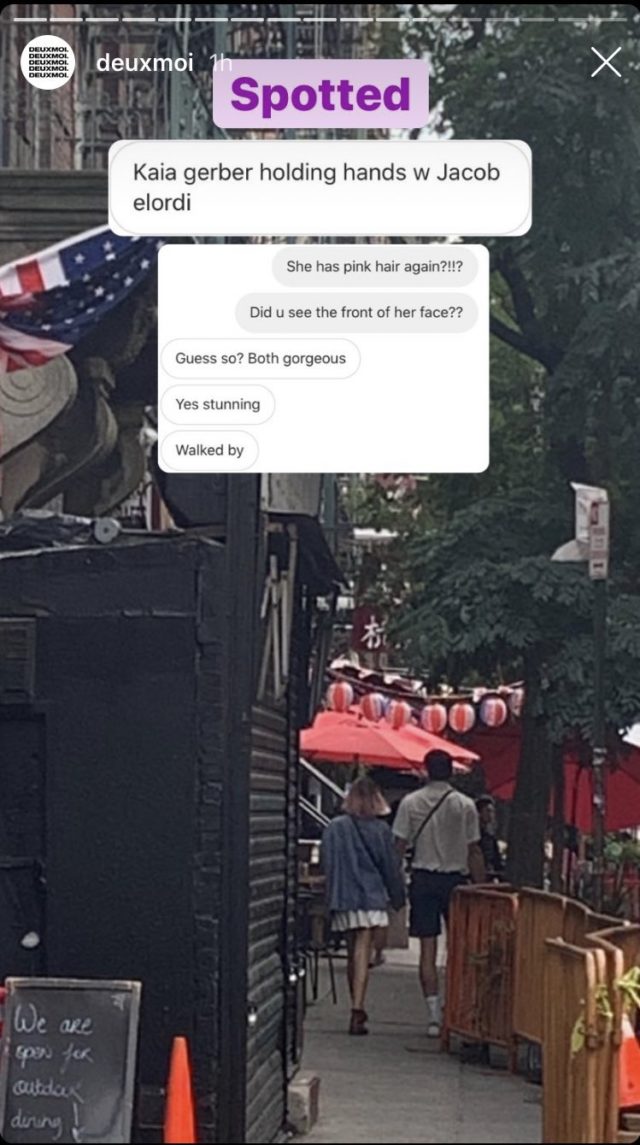Кайя и Джейкоб продолжают разжигать слухи об отношениях: сейчас в социальных сетях гуляет фотография, на которой видно, как пара держится за руки, прогуливаясь по улицам Нью-Йорка в понедельник. Другая фанатка тоже написал в Twitter о том, что видела их на свидании.