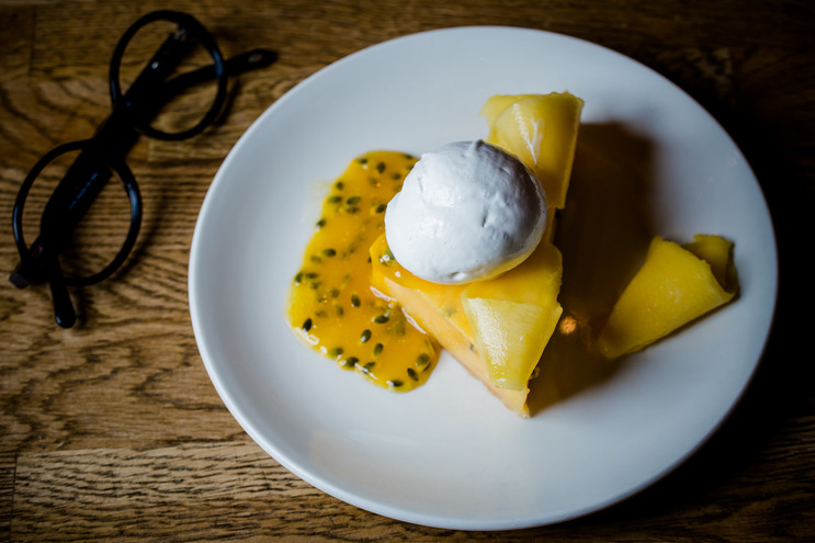 Готовый кейк разрезаем на части. Выкладываем на тарелку немного пюре из маракуйи, затем кейк, украшаем кусочками свежей маракуйи и шариком мороженого. Готово!