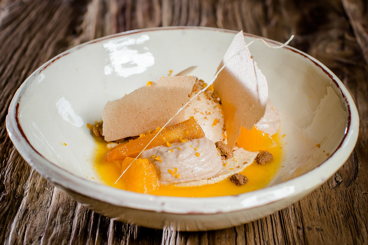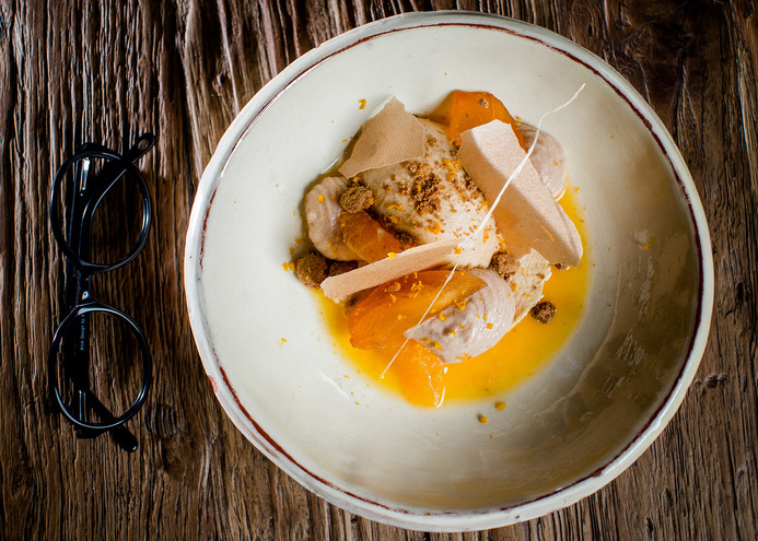 На тарелку выкладываем песочную базу, мусс из хурмы, каштановый крем, кладем кусочки хурмы и мандарина, поливаем соусом и украшаем каштановыми чипсами.