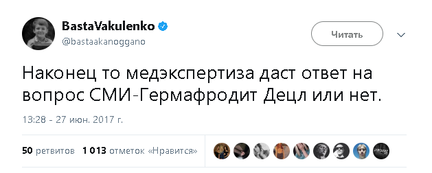 В общем, из 4 миллионов, которые так хотел Децл, рэпер получит только 350 тысяч рублей. Басту признали виновным в оскорблении Децла — оскорбительным посчитали твит про гермафродита. Адвокат Василия призвал провести медэкспертизу для установления признаков гермафродитизма у Кирилла, но суд отклонил ходатайство, посчитав, что это затянет судебный процесс. Напомним, Баста обещал удалить расстроивший Децла твит и принести ему свои извинения, если Кирилл сможет доказать, что он не гермафродит.