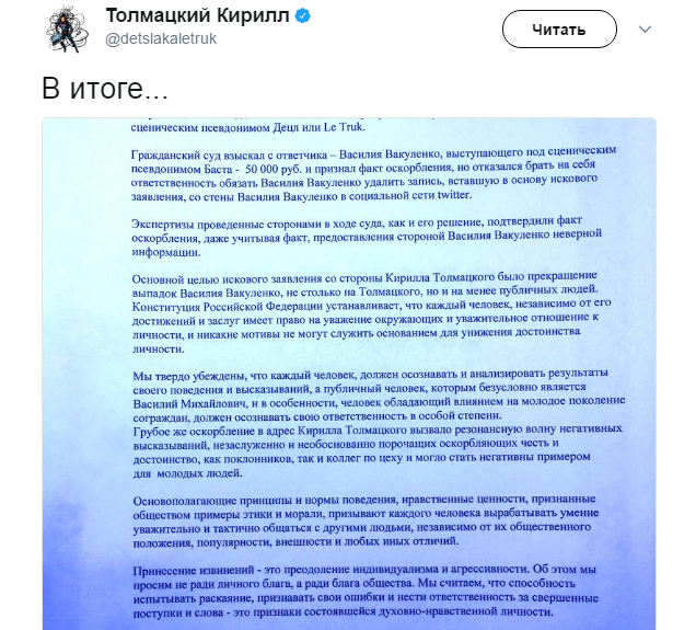 А в июне этого года Толмацкий подал сразу четыре иска. Компенсация по каждому составляет миллион рублей. Исполнителя оскорбил твит, в котором Баста опубликовал коллаж из фотографий Толмацкого и снимок мамонтового осла, написав внизу «знатная шерсть». Помимо этого, причиной исков стали посты, в которых Вакуленко называет Децла гермафродитом и устраивает опросы среди подписчиков, верят ли они этому. Фотоколлаж Децла и мамонтового осла Баста объяснил так: «Эта фотография была опубликована в ответ на непрекращающиеся выпады Кирилла Толмацкого в мою сторону и в сторону моих коллег. Он постоянно в интервью, в Facebook рассуждает почему-то обо мне, моей музыке и моих друзьях».