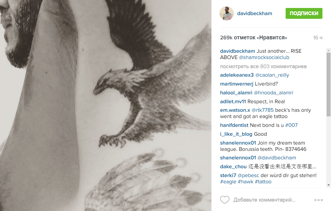 Спортсмен снова решил поделиться новостью с поклонниками через Instagram, опубликовав фото татуировки в виде гордого парящего орла. «Просто еще одна…Поднимаюсь выше», — написал футболист.