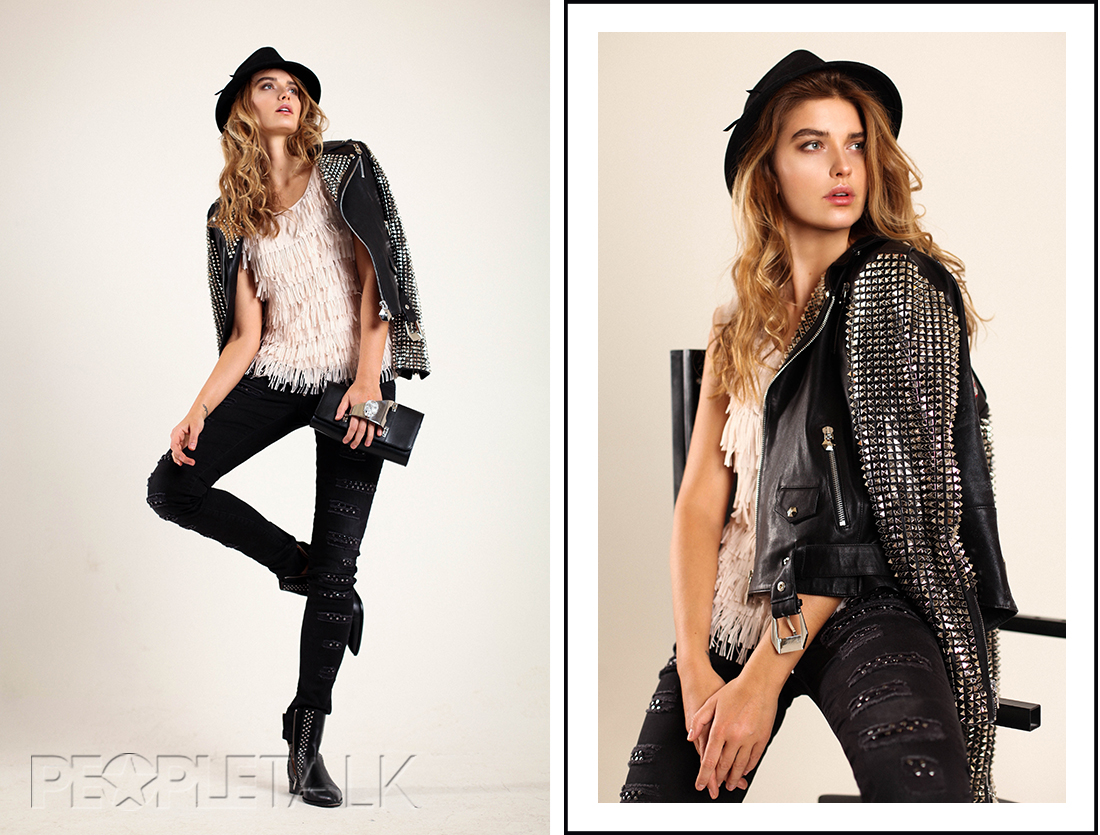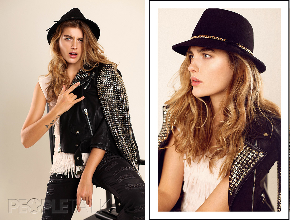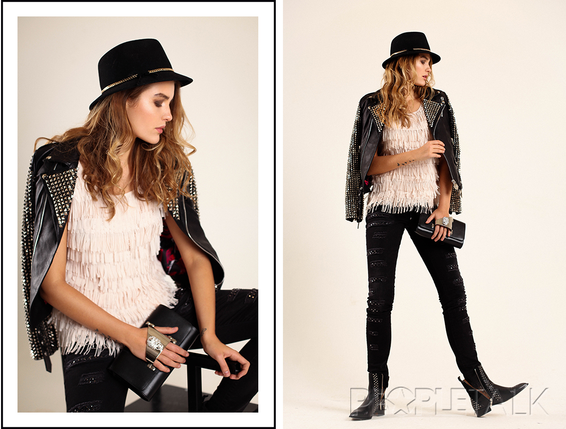 Джинсы, косуха и клатч, Philipp Plein; топ и ботинки, Marc Cain; шляпа, Uterque;