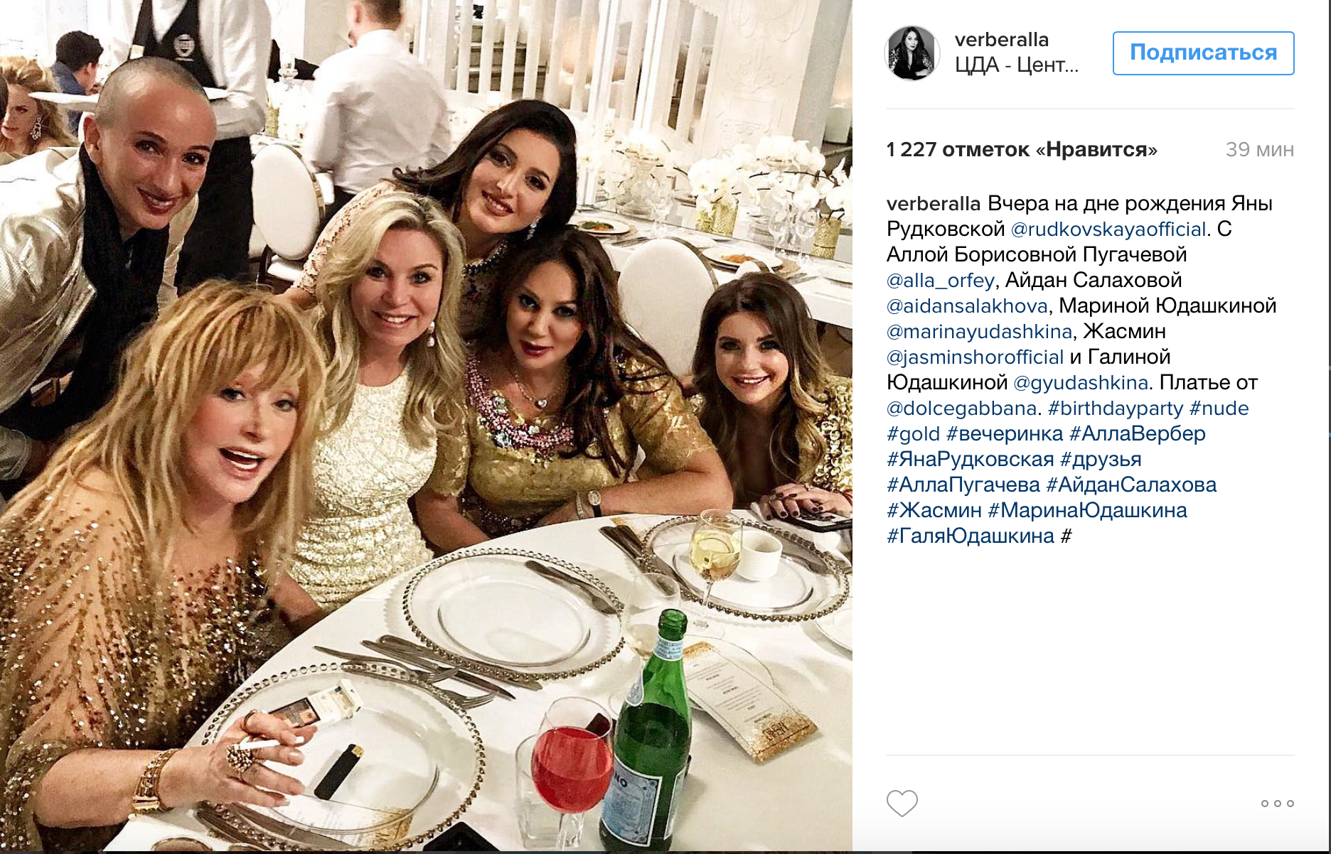 Алла Пугачева самая первая поздравила Рудковскую. «Можно заработать почет и уважение, но это ничего не стоит, если нет достоинства. И я безумно рада констатировать тот факт, что у тебя, детка моя, это достоинство есть. Оно проявляется в твоих поступках, в твоих приемах, в том, как ты одеваешься. У тебя удивительный сын Гном Гномыч, потрясающий муж, великолепные друзья. Слава богу, что жива мама, и видит все это счастье. Друзья, поднимем бокалы за Яну!» — сказала, обращаясь к имениннице, Алла Борисовна.
