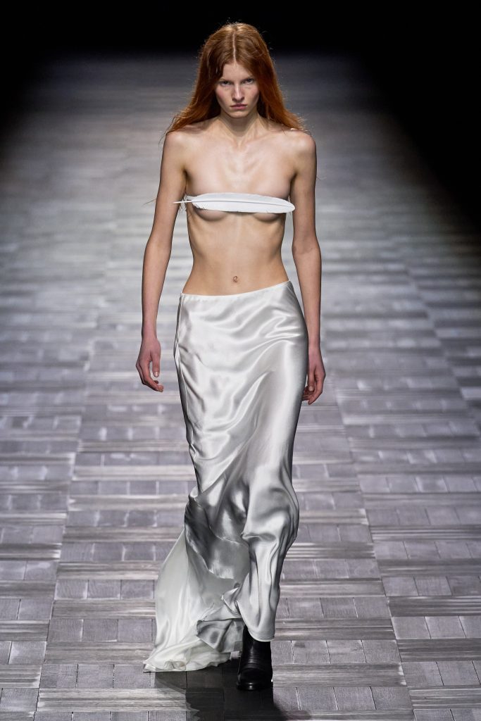 И ведь сегодня в подобных дизайнерских решениях нет ничего необычного – вспоминаем осенне-зимнюю коллекцию бельгийского бренда Ann Demeulemeester, которую не упомянул только ленивый модный telegram-редактор. Апогеем показа стали микротопы с пером птицы – помнится, за белый вариант на мартовской вечеринке «Оскара – 2023» голосовала звезда «Эйфории» Хантер Шафер. Нужно ли вспоминать, что образ последней быстро попал в категорию лучших аутфитов с мероприятия Vanity Fair. Поэтому, все верно: теперь подобные айтемы – часть нашей обычной реальности.