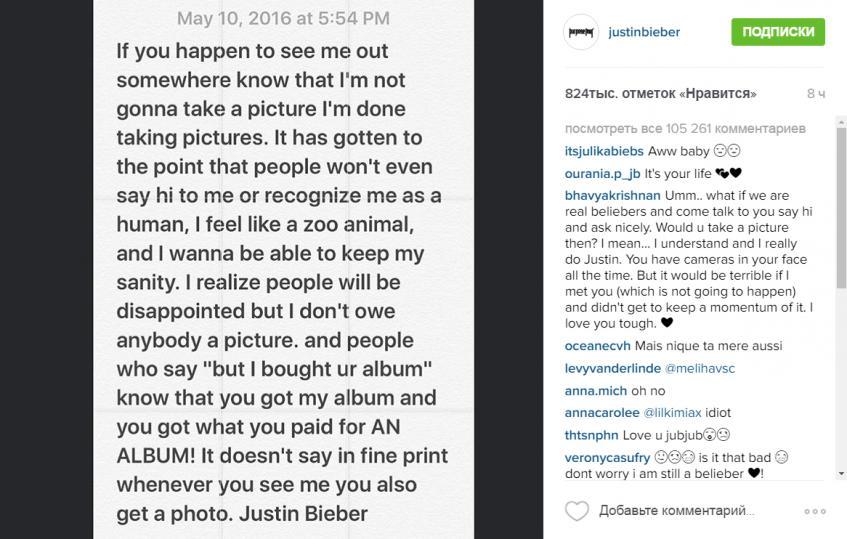 Напомним: когда поклонники начали буквально набрасываться на певца на каждом шагу, Джастин заявил, что больше не намерен фотографироваться с ними. Он написал: «Если вы встретите меня где-нибудь, то знайте, что я не буду фотографироваться с вами. Все дошло до такой степени, что люди даже не стараются сказать мне «привет» и не видят во мне человека».