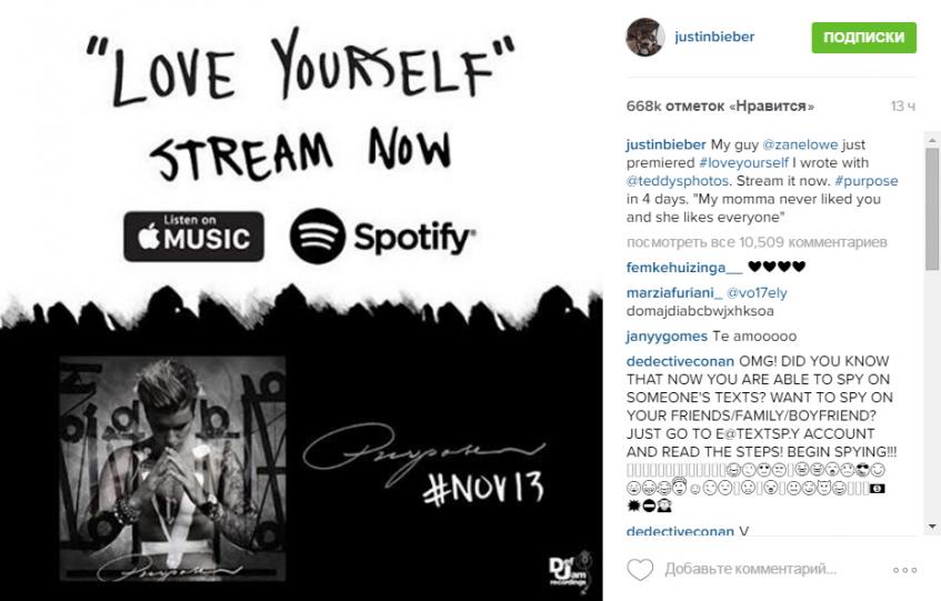 Новая песня «Love Yourself» была опубликована певцом 9-го ноября. Конечно, многие поклонники сразу обратили внимание на текст, который, по их мнению, намекает на отношения певца с Селеной Гомес (23): «Когда ты сказала мне, что ненавидишь моих друзей, это была твоя проблема, но не их. И каждый раз, когда ты говорила, что мое мнение неверно, ты пыталась заставить меня забыть о том, откуда я».