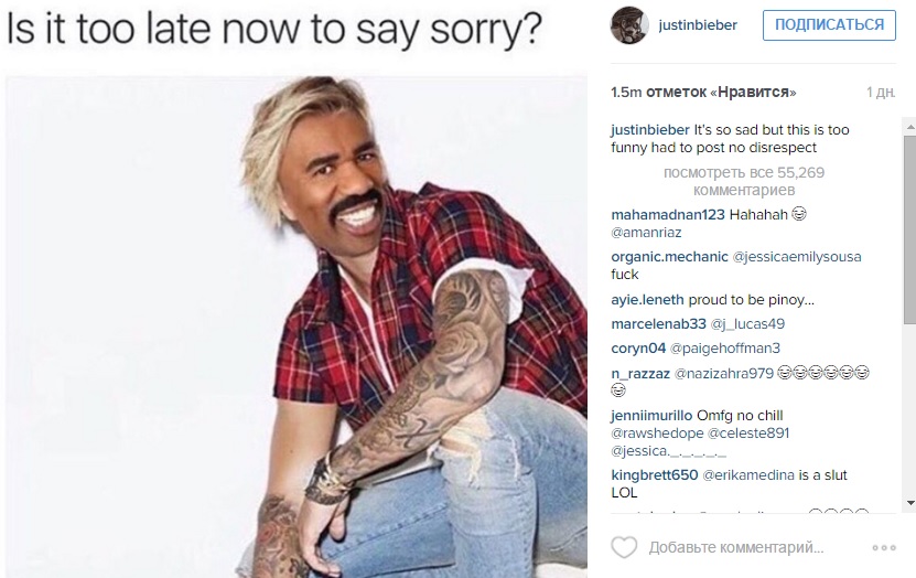 Певец отметил: «Это так грустно, но так смешно. Должен был это выложить. Никакого неуважения». Поклонники Джастина остались в восторге от этой картинки и похвалили его за неравнодушие в комментариях.