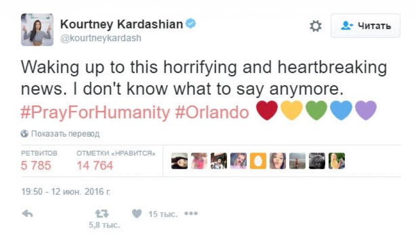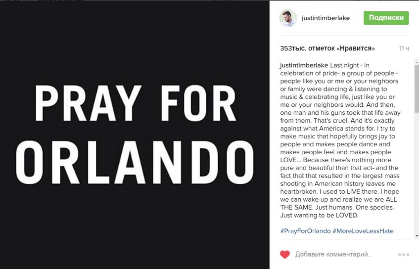 Вчера, 12 июня, весь мир был шокирован страшной новостью, которая пришла из американского штата Орландо. В ночь на воскресенье Омар Матин напал на ночной гей-клуб Pulse. Преступник, вооруженный винтовкой и пистолетом, закрылся вместе с несколькими заложниками в клубе. В результате длительной перестрелки с полицией нападавший был уничтожен, только после этого спецназ освободил заложников. В результате были убиты 50 человек, еще 53 получили ранения. Конечно, никто не мог остаться в стороне, узнав о страшном происшествии, в том числе и звезды.
