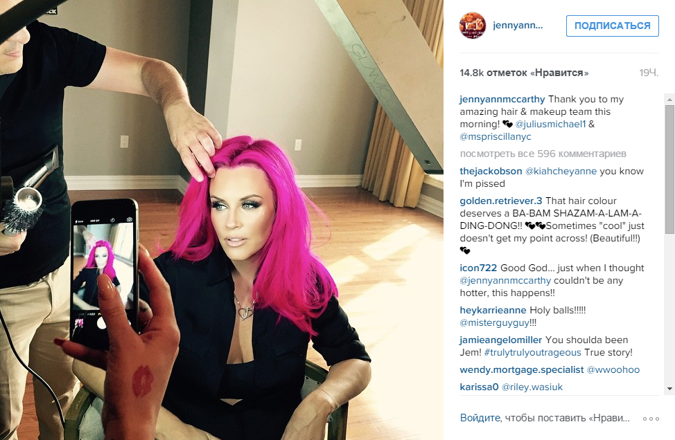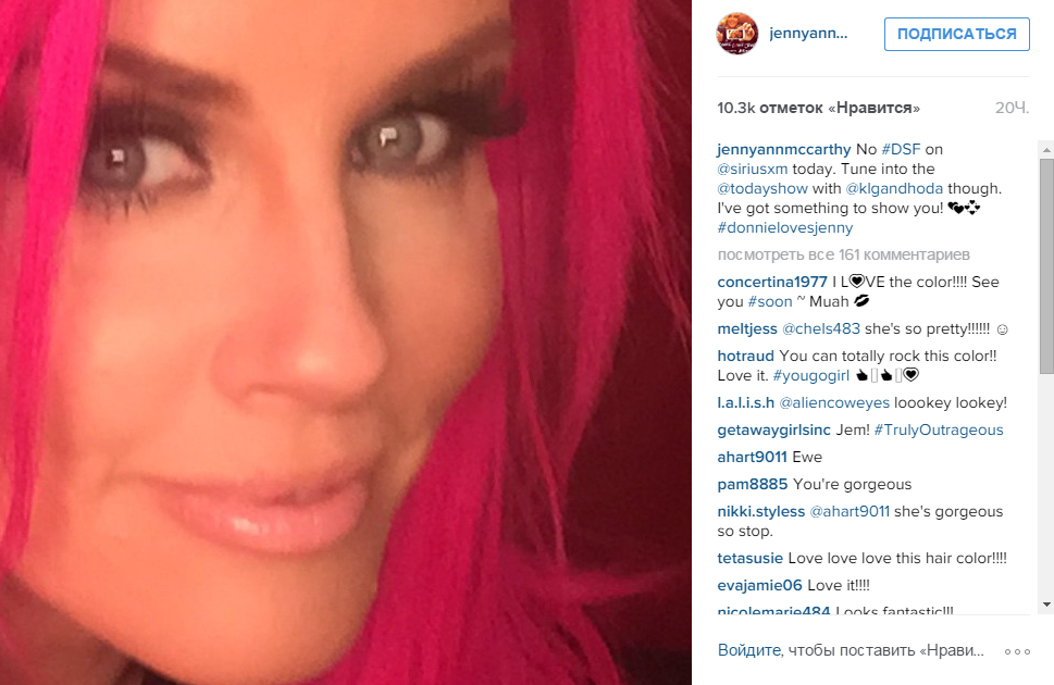 Известная блондинка опубликовала в Instagram фото новой прически. Вместо привычных светлых волос поклонники увидели, как Дженни хвастается ярко-розовыми локонами. Стоит отметить, что девушка перекрасила волосы специально для своего появления в The Today Show. Там она рассказала о новом сезоне шоу «Донни любит Дженни», в котором главными героями являются актриса и ее муж Донни Уолберг (45).