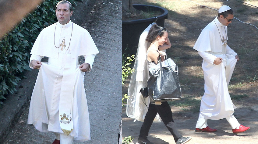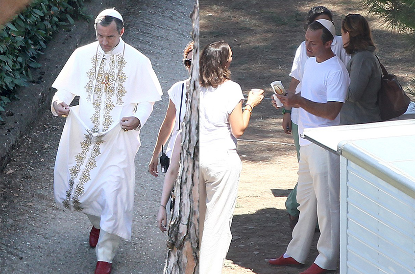Сейчас Джуд принимает участие в сериале «The Young Pope», который снимается на вилле Медичи в Риме. Актер появился на площадке в белых брюках, рясе и красных туфлях. Одеяние папы действительно преобразило звезду. Конечно, в этом ему помогли гримеры и стилисты, которые аккуратно уложили волосы звезды.