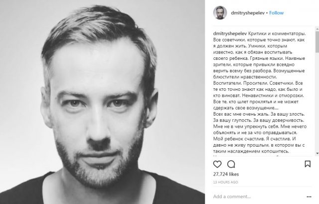 И, кажется, злобные комментарии в очередной раз посыпались на Шепелева, потому что сегодня в своем Instagram он написал: «Критики и комментаторы. Все советчики, которые точно знают, как я должен жить. Умники, которым известно, как я обязан воспитывать своего ребенка. Грязные языки. Наивные зрители, которые привыкли всеядно верить всему без разбора. Возмущенные блюстители нравственности. Воспитатели. Просители. Советчики. Все те, кто точно знают как надо, как было и кто виноват. Ненавистники и отморозки. Все те, кто шлет проклятья и не может сдержать свое возмущение…. Всех вас мне очень жаль. За вашу злость. За вашу глупость. За вашу доверчивость. Мне не в чем упрекнуть себя. Мне нечего объяснять и не за что оправдываться. Мой ребенок счастлив. Я счастлив. И давно не живу прошлым, в котором вы с таким наслаждением копошитесь. Наведите порядок в своих образцовых жизнях. А до тех пор уймитесь, безумные. Займитесь собой и своими проблемами. С новым годом. Добра вам всем»