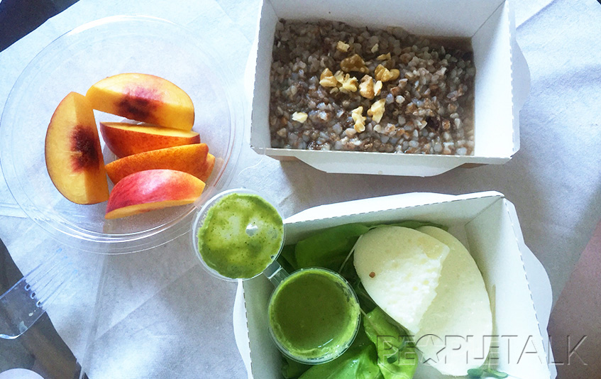 В 8:00 состоялся мой завтрак. На этот раз диетолог прислал мне свежий сок из яблока, сельдерея, лимона, свеклы и корня имбиря, гречневую кашу с орехами и вкуснейший низкокалорийный творог.