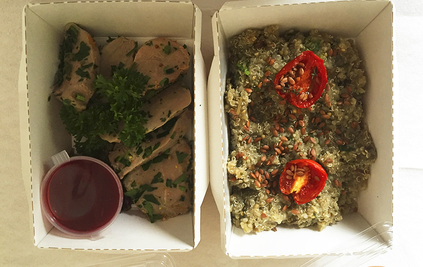 В ожидании обеда я сегодня сильно проголодалась. И как только часы пробили 16:00, накрыла себе на работе стол. В меню утиная грудка в специях, киноа с баклажанами, вялеными помидорами и семенами льна и цельнозерновой хлеб с пребиотиками. Обед был очень вкусный, но не думаю, что после окончания проекта киноа станет моим спутником жизни. Я так и не поняла его вкус.