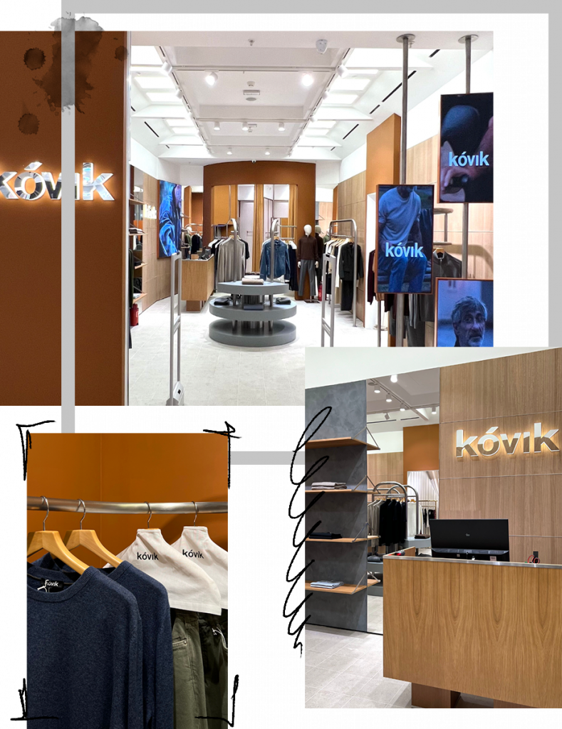 Kóvik представлен в обновлённом формате – как бренд мужской одежды. Интерьер выдержан в эстетике постсоветского конструктивизма с отсылкой к абхазским корням: серо-голубые и карамельные тона, нержавеющая сталь, строгая геометрия потолка и винтажные кресла Эрнста Моекля. Это пространство транслирует философию бренда – внимание к форме и традиции. Therozie противопоставляет ему свою «архитектуру света»: волнообразные панели, зеркальные поверхности и мягкие линии формируют камерное, но притягательное пространство. Свет и отражения создают ощущение глубины, делая интерьер визуально свободным.