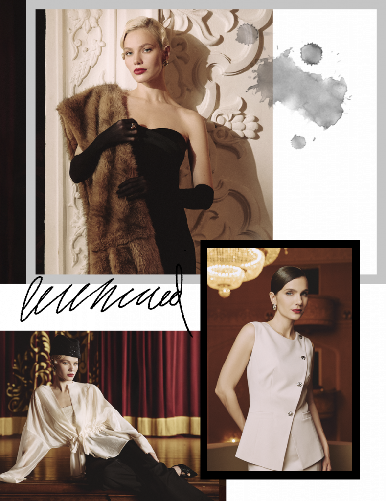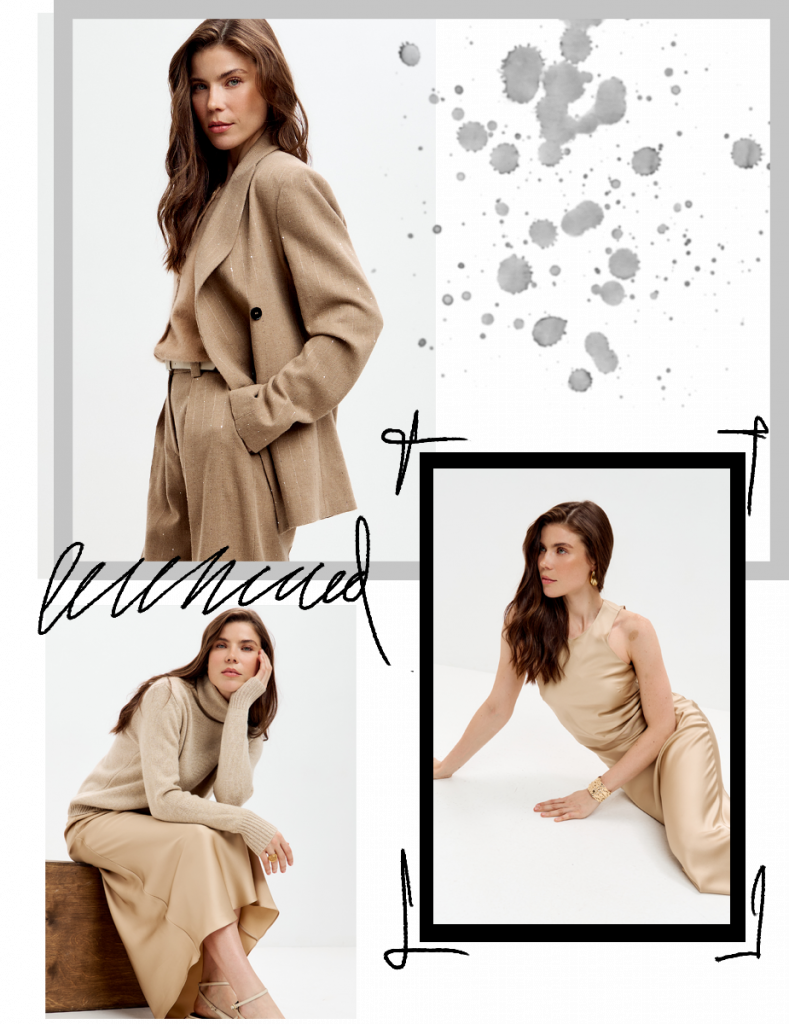 В капсуле – ключевые вещи для зимних выходов: шерстяные брючные костюмы, в том числе с деликатным люрексом, лаконичное платье-пиджак, шелковые платья и юбки, а также кожаные леггинсы с редкой технологией обработки и плиссированная мини из эко-кожи. Все – про комфорт, точную посадку и ту самую сдержанную выразительность, когда образ не требует лишних комментариев, но работает безошибочно.