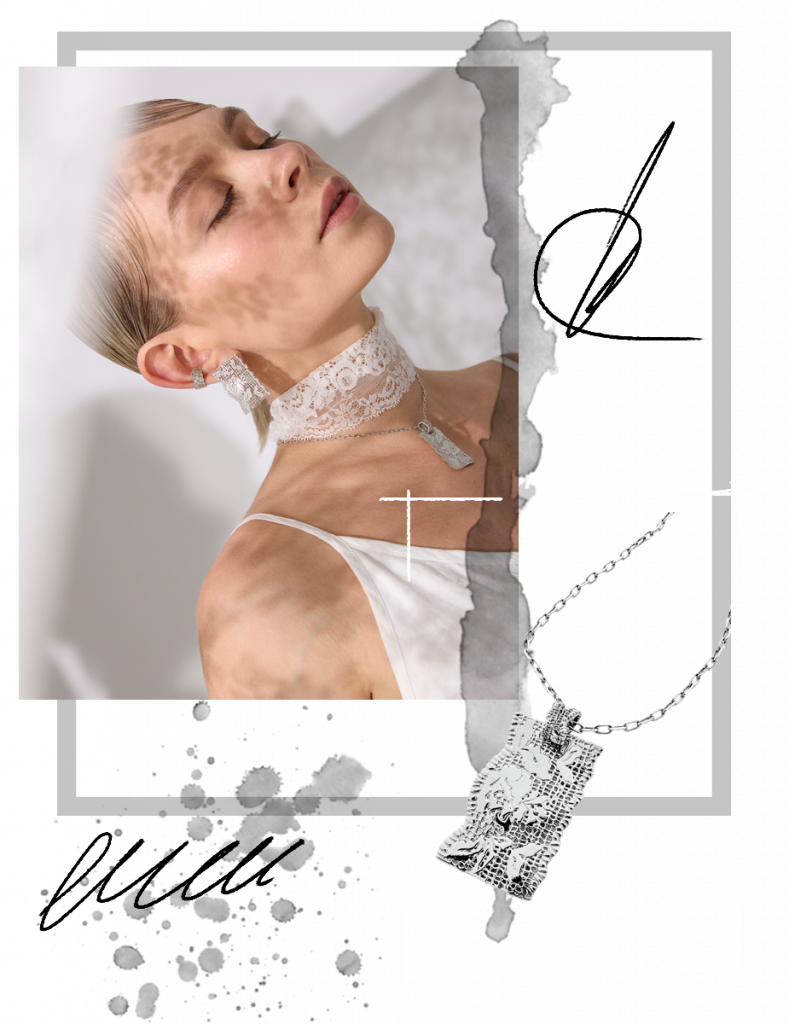 Формы коллекции развиваются дальше: круглые и цветочные подвески, а также аксессуар, который можно использовать как декоративную накладку на пуговицу. Это небольшие ювелирные эксперименты, в которых кружевная текстура получает новое звучание.