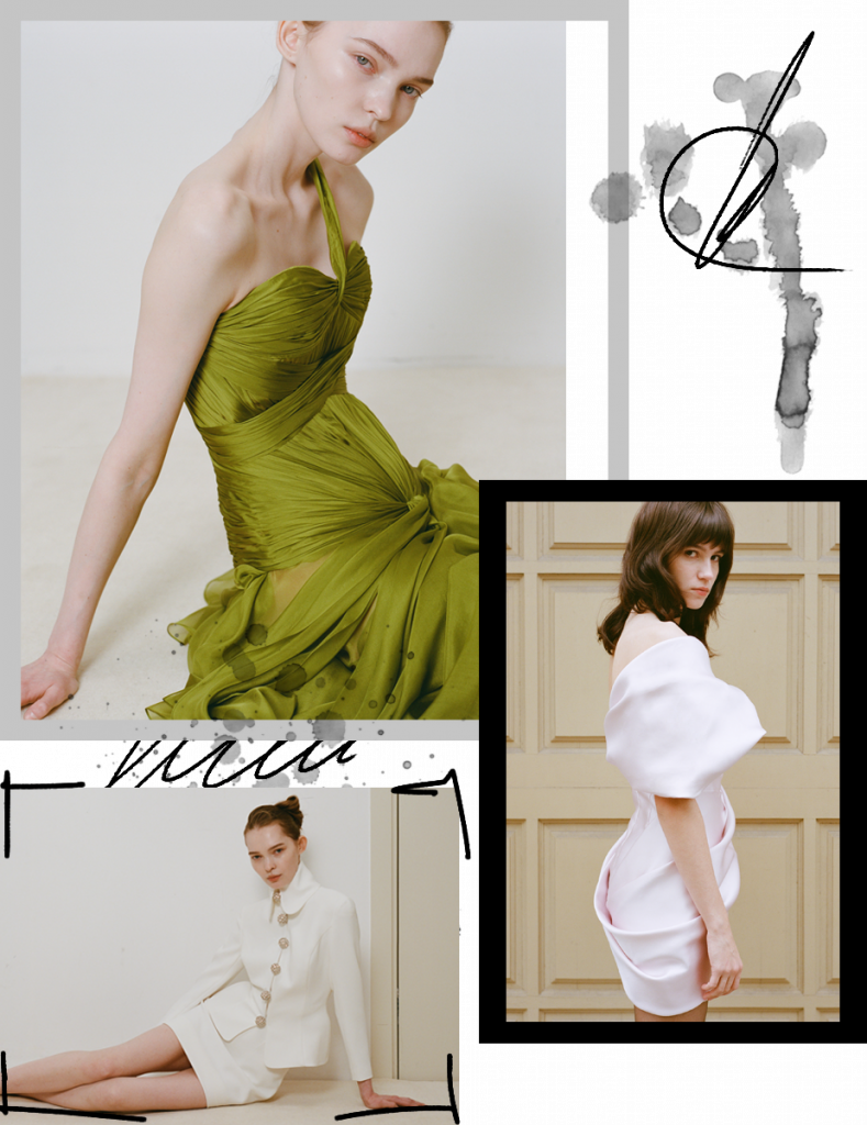 Силуэты Валентина Юдашкина переосмыслены деликатно: архитектурные формы стали легче, а пропорции – современнее. Палитра включает молочный, жемчужный, песочный, дымчато-голубой, графитовый и глубокий шоколад – спокойные, но выразительные оттенки. В работе использованы разные типы шелка, шифон и дюшес с добавлением шерсти – материалы подобраны так, чтобы подчеркивать ремесленную работу в движении. Коллекция балансирует между классикой и прогрессивным настроением, оставаясь узнаваемой: все изделия создаются внутри Дома – от эскиза до последнего стежка.