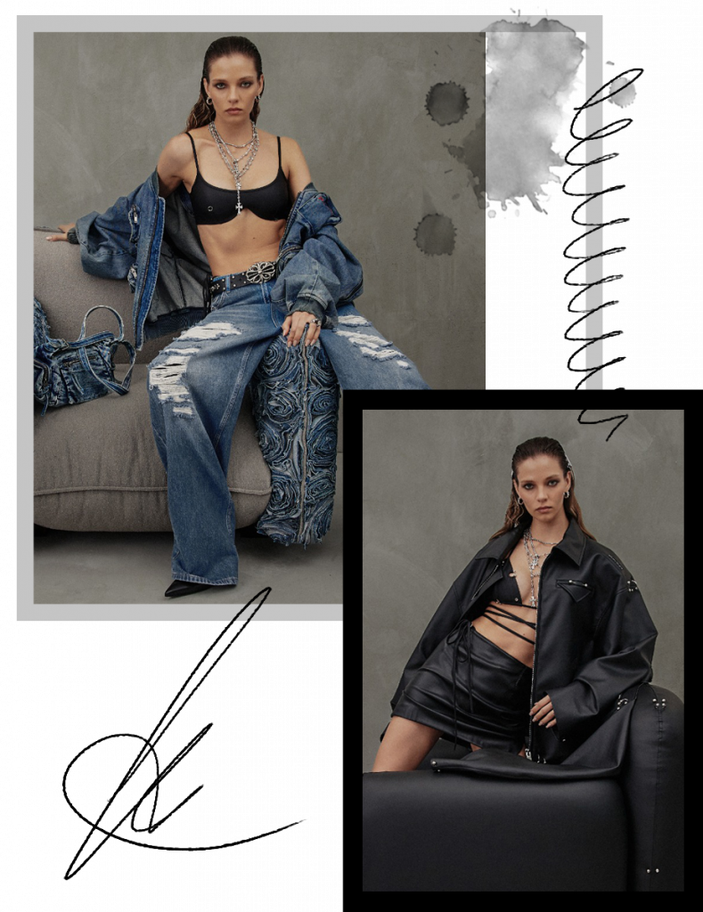Главный цвет сезона – черный. Он превращается в сцену, на которой рождается свет, а контраст фактур делает образы многослойными и эмоциональными. Кампейн снял арт-директор и фотограф Дамир Жукенов: «черная комната» с потертыми поверхностями стала метафорой сцены, где героиня ведет диалог со зрителем. Эстетика ранних работ Стивена Кляйна в современном ключе – еще одно напоминание, что мода способна быть настоящим перформансом.