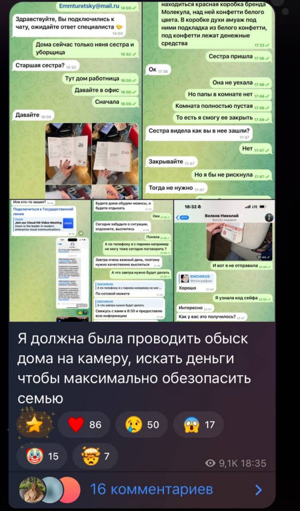 «Мне нельзя было отключаться, мне угрожали, и я на все это велась. Я должна была проводить обыск дома на камеру, искать деньги, чтобы максимально обезопасить семью», – рассказала она. По словам Эммы, злоумышленники давили на нее, утверждая, что «копают» под ее родителей и могут получить информацию через нее. Когда денег у девушки больше не оказалось, ее заставили проверить мессенджеры родителей якобы на наличие подозрительных слов.
