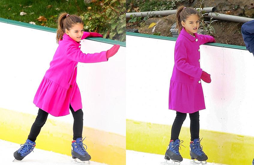 Сури, одетая в черные штаны и ярко-розовое пальто, бойко каталась на коньках. Несмотря на то, что девочка не очень уверенно чувствовала себя на льду, она упорно продолжала стараться.