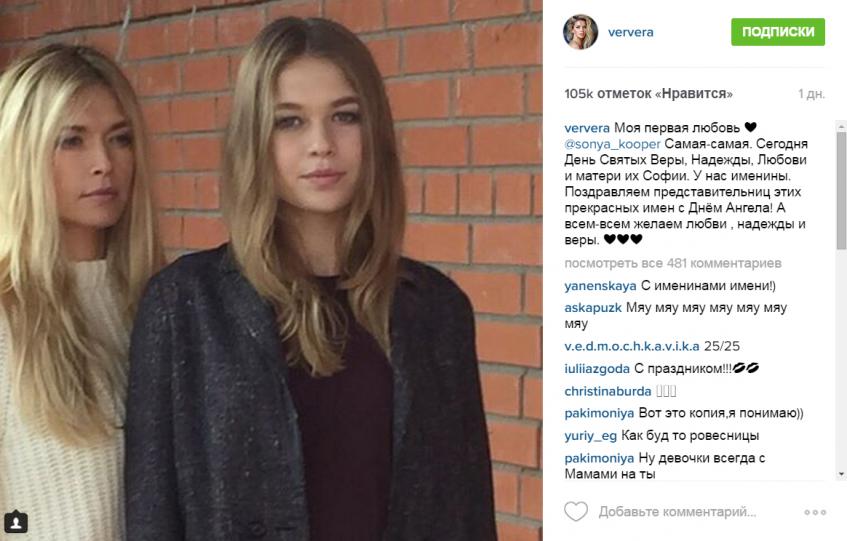Особенно хорошо это заметно на фотографии, которую 30 сентября Вера опубликовала в Instagram. Соня уже сейчас выше своей мамы и как две капли воды похожа на нее. «Моя первая любовь. Самая-самая. Сегодня День Святых Веры, Надежды, Любови и матери их Софии. У нас именины. Поздравляем представительниц этих прекрасных имен с Днём Ангела! А всем-всем желаем любви, надежды и веры.», — написала певица.
