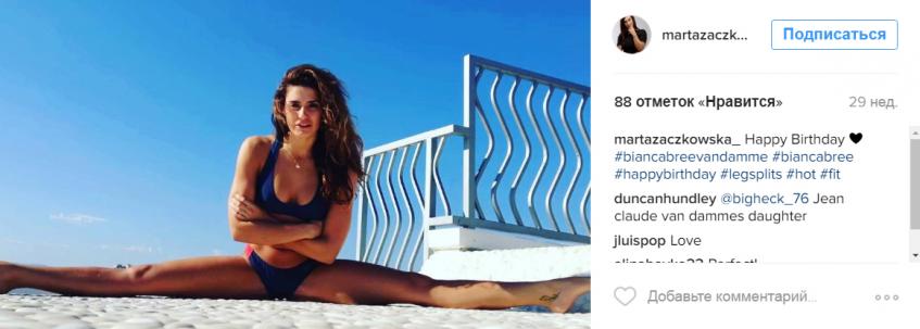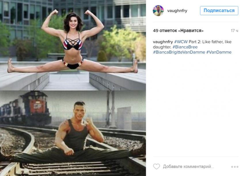 На одном из снимков (на которых, к слову, видна великолепная фигура) Бьянка сделала легендарный поперечный шпагат, который ее отец не раз демонстрировал в кино и рекламе. «Я хочу показать маленьким девочкам и маленьким мальчикам, что можно быть физически сильной, но при этом оставаться женственной. Что можно элегантно скрещивать ноги за обеденным столом и в то же время суметь навалять хулигану самым милым и женственным образом. Мой отец превратил увлечение боевыми искусствами в мейнстрим, я хочу продолжить это наследие», — рассказала девушка в интервью изданию.