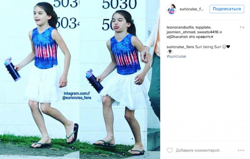 На днях папарацци застали Сури в тот момент, когда она вместе со своей бабушкой выходила из спортивного зала, где занимается гимнастикой. Юная кокетка, одетая в спортивное трико, юбку и шлепки, весело смеялась и дразнила прохожих, показывая язык. Конечно, пользователи Сети были очень рады увидеть подросшую Сури, которая редко в последнее время попадает в объективы фотокамер.