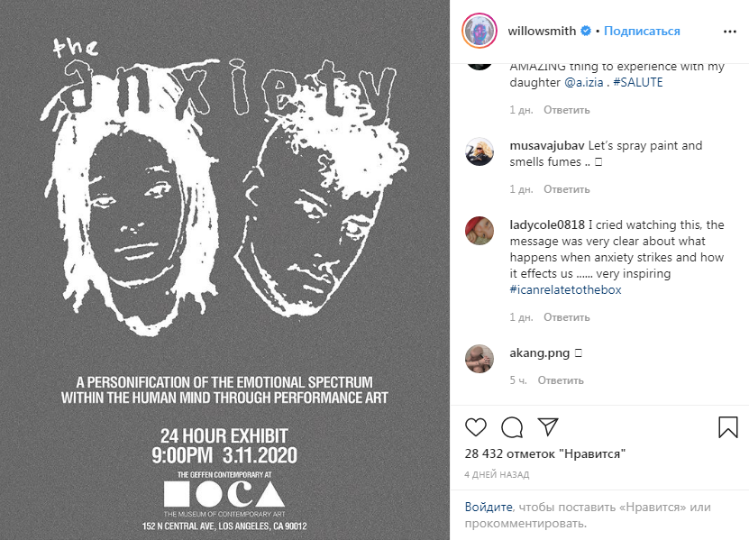 Дочка Уилла Смита (51) Уиллоу (19) провела 24 часа в стеклянной коробке в рамках арт-перфоманса под названием «Тревога». Об этом сообщает Dazed.