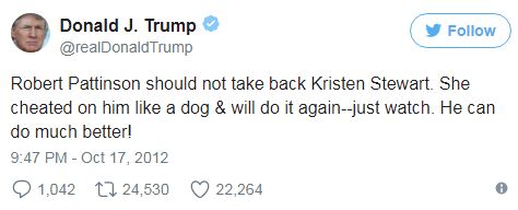 Он написал тогда целую серию твитов, в которых просил Роберта поумнеть и бросить Кристен: «Роберт Паттинсон не должен принимать обратно Кристен Стюарт. Она изменила ему как с*ка и будет делать это дальше — просто наблюдайте. Он может себе найти кого-нибудь намного лучше! Огромное количество отзывов к моей записи о воссоединении Паттинсона и Кристен Стюарт. Она ему снова изменит — уверен на все 100 — а разве я когда-нибудь ошибаюсь?» Роберт и Кристен после этого, конечно, расстались.