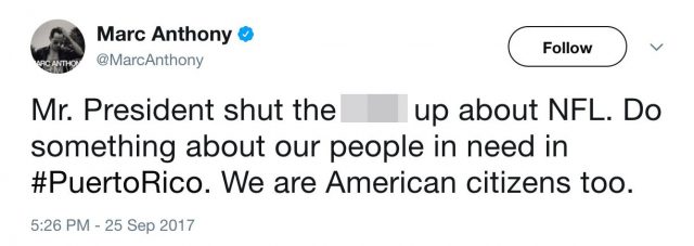 Музыкант Марк Энтони (49) не смог промолчать и высказался по поводу этой ситуации. По его мнению, президент страны сейчас должен думать не о том, кого выгнать из «НФЛ», а о том, как помочь пострадавшим жителям острова Пуэрто-Рико, на который обрушился самый мощный за последние 90 лет ураган «Мария». По последним данным, погибло по меньшей мере 55 человек.