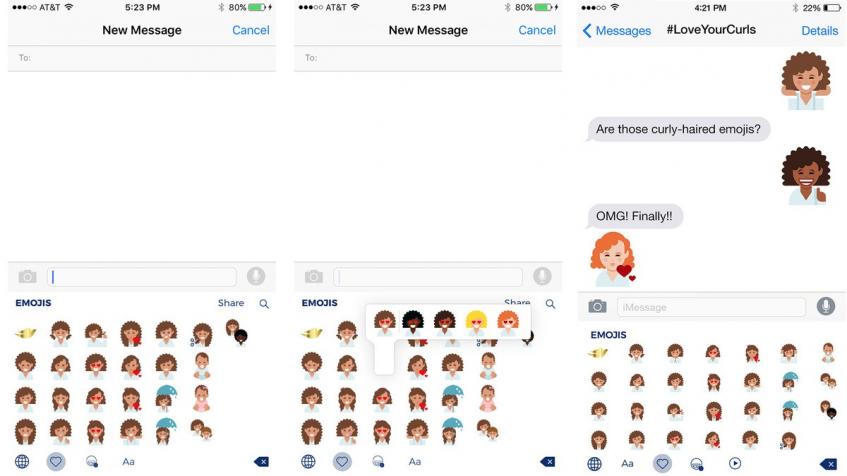 Действительно, большинство стандартных смайлов лишено фактуры волос. В рамках кампании #LoveYourCurls, направленной на чествование всех видов вьющихся локонов, Dove создала собственную коллекцию великолепных символов специально для тех, кому не достаточно стандартного набора.