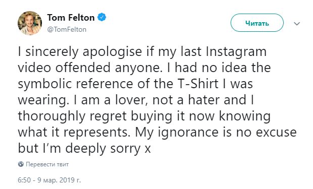Фелтон удалил видео и сердечно извинился перед фанатами: «Я прошу прощения, если моё последнее видео в Instagram кого-то обидело. Я понятия не имел, что за символ был изображён на моей футболке. Я вселюбящий, не ненавистник, и теперь сожалею, что купил её, не зная значение символа. Моё невежество — не оправдание, но я очень сожалею».