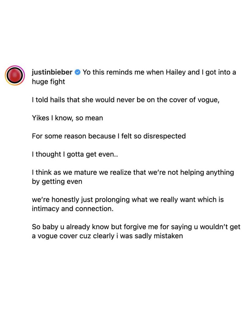 Ему пришлось извиниться перед Хейли за свои слова из прошлого. Он не верил в то, что модель добьется такого успеха. «Я вспомнил о нашей с Хейли крупной ссоре. Тогда я сказал ей, что она никогда не появится на обложке Vogue. Это было грубо. Прости меня за то, что я сказал, что ты не попадешь на обложку Vogue, потому что, очевидно, как я ошибся», – написал певец на своей странице.