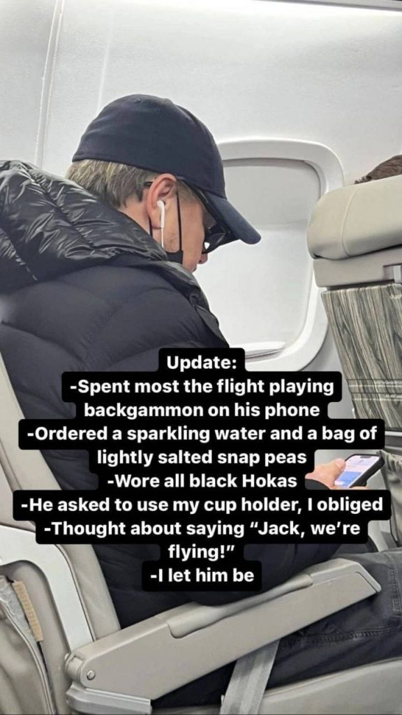 А вот и отчет: «Большую часть полета играл в нарды в телефоне. Заказал газированную воду и пачку слегка подсоленного зеленого горошка. Был в черных кроссовках марки Hoka (довольно бюджетный бренд). Он попросил воспользоваться моим подстаканником, я подчинился. Я думал сказать: «Джек, мы летим!» Я оставил его в покое».