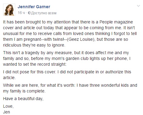 В суд Джен подавать не собирается. Она просто написала большой пост в Facebook: «Мое внимание привлек вышедший сегодня номер People, который производит впечатление, будто я принимала в создании этой статьи участие. Я уже привыкла получать звонки от близких с укорами в том, что я забыла сообщить им нечто очень важное — например, мою очередную беременность, причем сразу двойней. Но это настолько нелепо, что даже реагировать не хочется. Этот номер — тоже не трагедия, но все же он напрямую затрагивает меня и тех, кого я люблю, поэтому я решила расставить все точки над i. Я не позировала для этой обложки. Я не участвовала в создании этой статьи. Все, что сейчас важно: у меня есть трое детей и у нас полная семья. Хорошего дня».