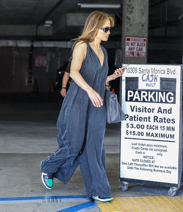 Дженнифер надела струящийся уютный комбинезон, из-под которого виднеется белое бра. Такой элегантный образ она сочетает с зелеными кроссовками Nike Air Jordan и вместительной кожаной сумкой. В качестве аксессуаров Лопес добавила солнцезащитные очки и золотистую цепь.