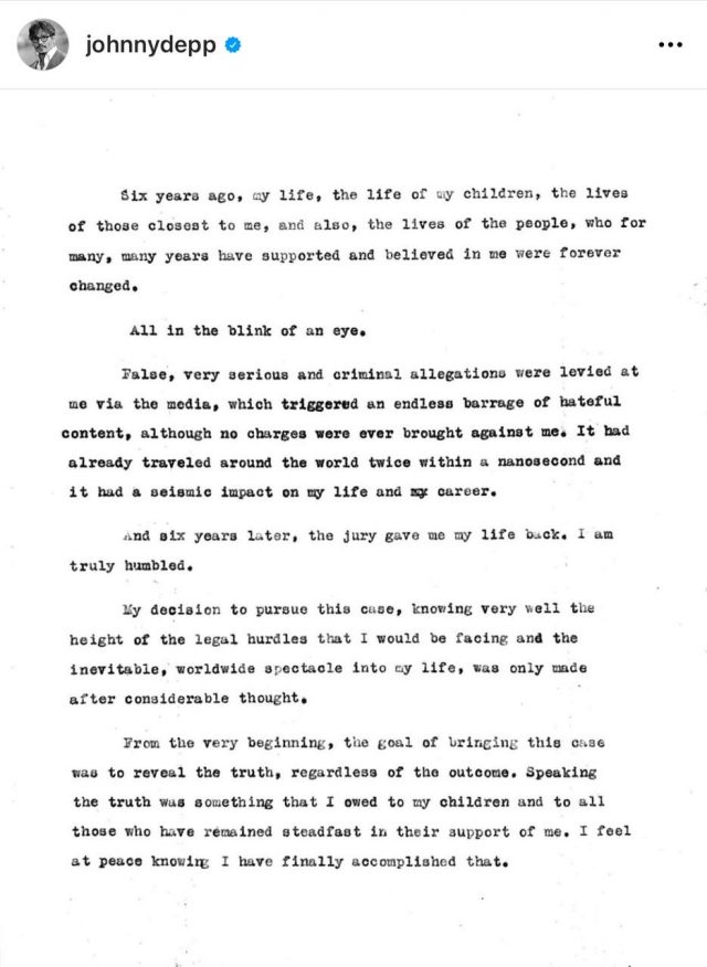 «Разочарование, которое я испытываю сегодня, не поддается описанию. Я убита горем из-за того, что множества доказательств все еще было недостаточно, чтобы противостоять несоразмерной власти и влиянию моего бывшего мужа. Я разочарована тем, что этот вердикт означает для других женщин. Это провал. Это возвращает нас обратно к тому времени, когда женщина, которая не боится высказываться, могла быть пристыжена и унижена публично. Это опровергает идею о том, что к насилию в отношении женщин следует относиться серьезно. Я считаю, что адвокатам Джонни удалось заставить присяжных не обращать внимание на ключевой вопрос свободы слова и игнорировать доказательства, которые были настолько убедительными, что мы выиграли в Великобритании. Мне грустно, что я проиграла это дело. Но еще печальнее то, что я, похоже, потеряла право, которое, как думала, имела будучи американкой, — говорить свободно и открыто».