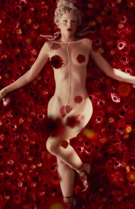 На первых кадрах 34-летняя знаменитость предстала лежащей на красных цветах. При этом одежда вовсе не скрывала голого тела звезды, которая слегка прикрылась соцветиями. Поклонники тут же рассмотрели в кадре отсылку к фильму «Красота по-американски» 1999 года.